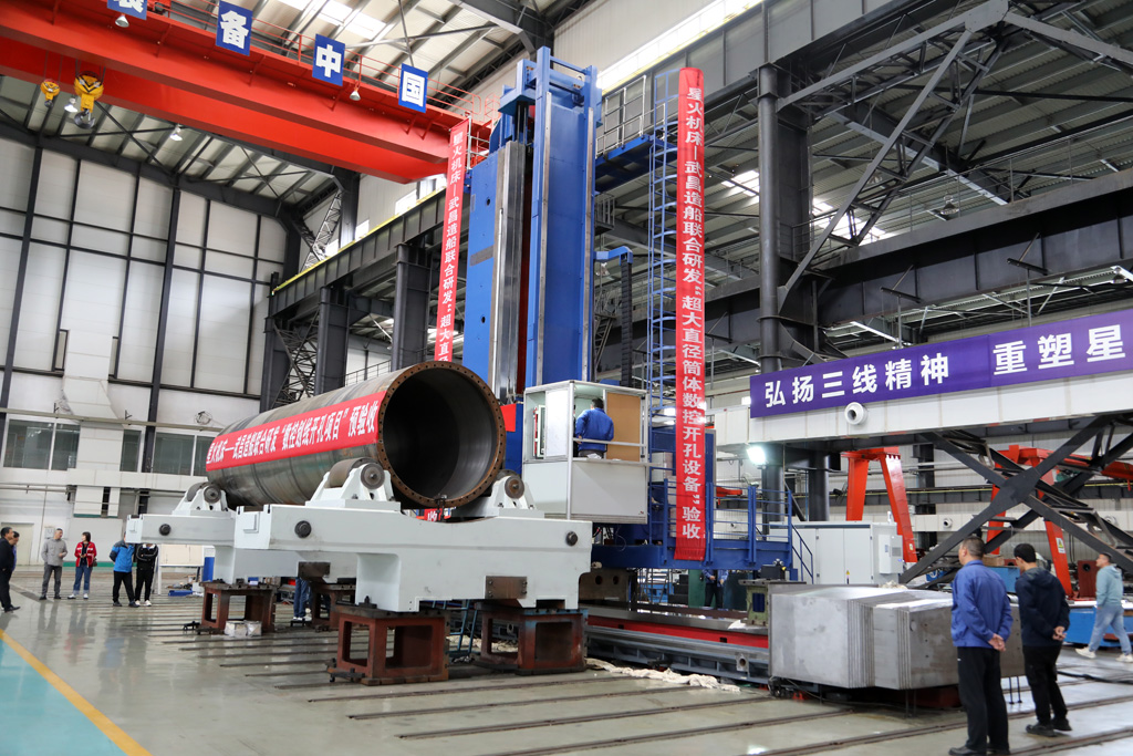 該超大直徑筒體數(shù)控開(kāi)孔設(shè)備主要采用五軸聯(lián)動(dòng)銑鏜加工技術(shù)、超大型筒體摩擦伺服驅(qū)動(dòng)技術(shù)、三維視覺(jué)掃描定位技術(shù)、程序參數(shù)化編程等關(guān)鍵技術(shù),用于超大筒型零件表面開(kāi)孔、孔口坡口的粗加工、半精加工和精加工。具有高精高效、結(jié)構(gòu)合理、操作方便、可靠性強(qiáng)等特點(diǎn),是目前國(guó)內(nèi)規(guī)格最大、技術(shù)水平最高、生產(chǎn)難度和自動(dòng)化控制程度最高的首臺(tái)(套)專(zhuān)用設(shè)備。突破了船舶制造等相關(guān)領(lǐng)域的技術(shù)壁壘,解決了我國(guó)無(wú)法依賴進(jìn)口等手段實(shí)現(xiàn)全自動(dòng)機(jī)械加工,精度低、勞動(dòng)強(qiáng)度大等 “卡脖子”難題。