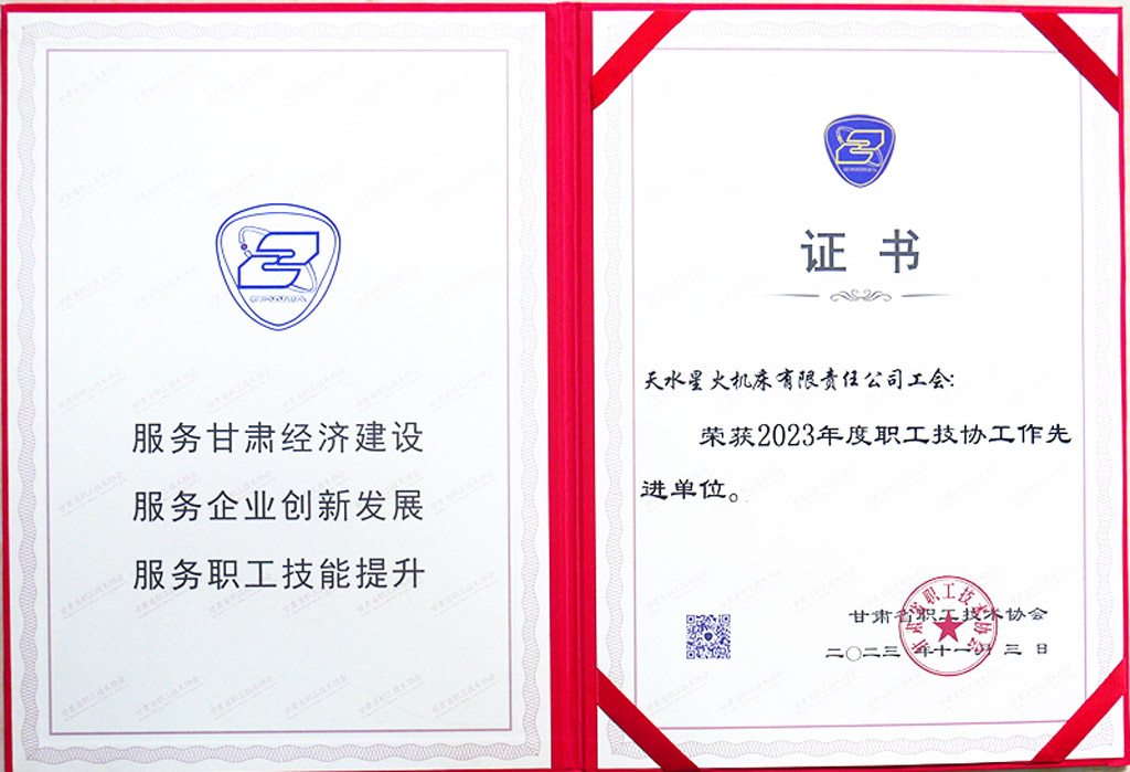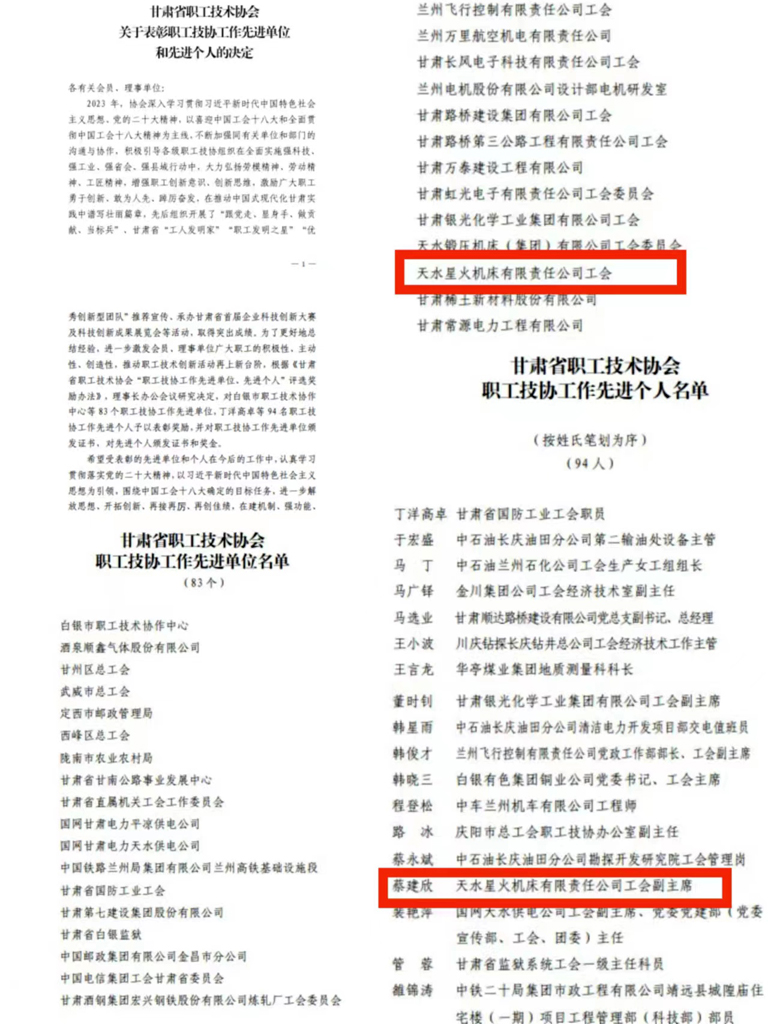 近日,甘肅省職工技術協(xié)會表彰全省職工技協(xié)先進,星火機床公司工會榮獲“2023年度職工技協(xié)工作先進單位”,工會副主席蔡建欣榮獲“2023年度職工技協(xié)工作先進個人”稱號。