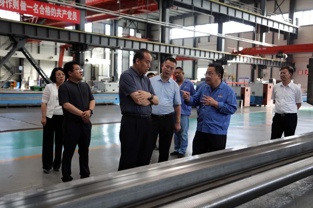 牛成喆一行深入工業(yè)園加工車間和青重裝配車間現(xiàn)場(chǎng),一邊了解產(chǎn)品,一邊詢問企業(yè)生產(chǎn)經(jīng)營(yíng)等情況。蔣保權(quán)向牛成喆一行介紹了企業(yè)重點(diǎn)產(chǎn)品的性能、用途等特點(diǎn)以及企業(yè)在科技創(chuàng)新和產(chǎn)品研發(fā)方面取得的成果。