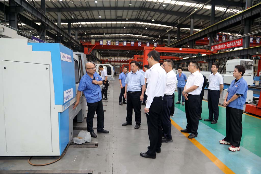 蔣俊代表公司向前來參觀和指導(dǎo)工作的各位領(lǐng)導(dǎo)表示歡迎,并詳細(xì)介紹了星火的歷史沿革、發(fā)展變化、企業(yè)文化以及科技創(chuàng)新等情況。在星火公司生產(chǎn)現(xiàn)場,領(lǐng)導(dǎo)們對裝配調(diào)試中的五軸聯(lián)動車銑復(fù)合加工中心和車輪車床、重型臥式車床等產(chǎn)品,紛紛贊不絕口,直觀的見證了星火的創(chuàng)新實(shí)力。
