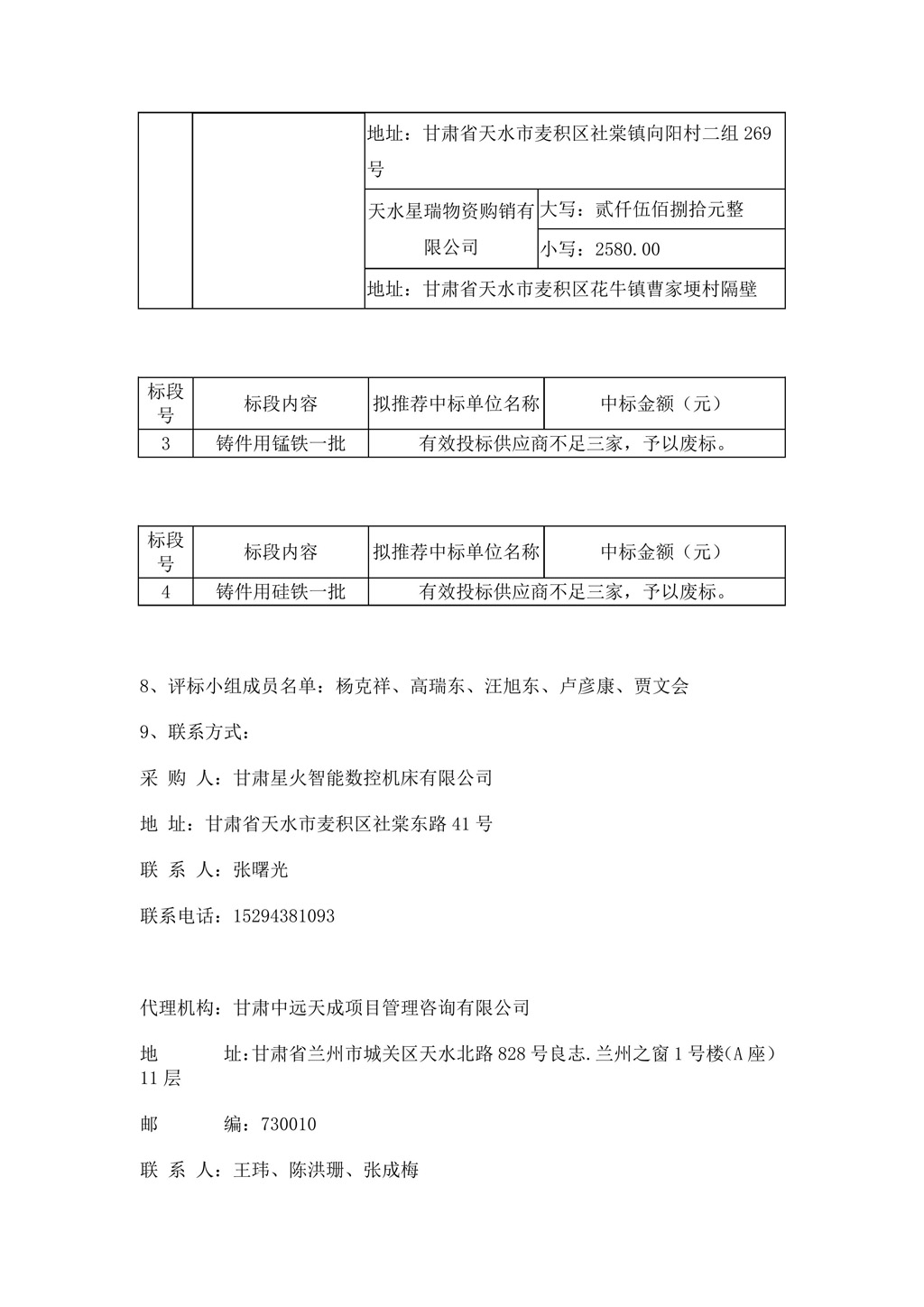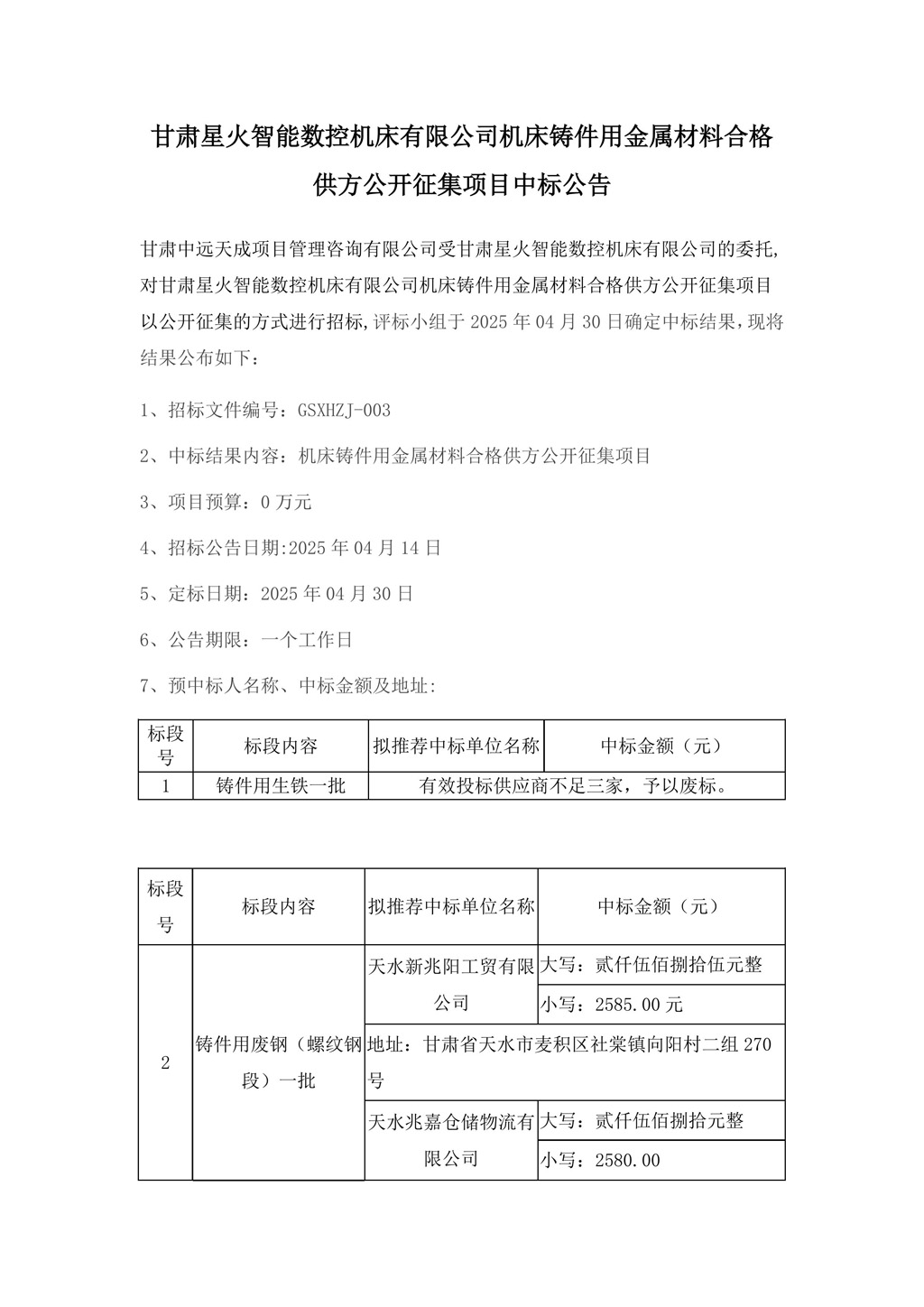 甘肅星火智能數(shù)控機床有限公司機床鑄件用金屬材料合格供方公開征集項目中標公告