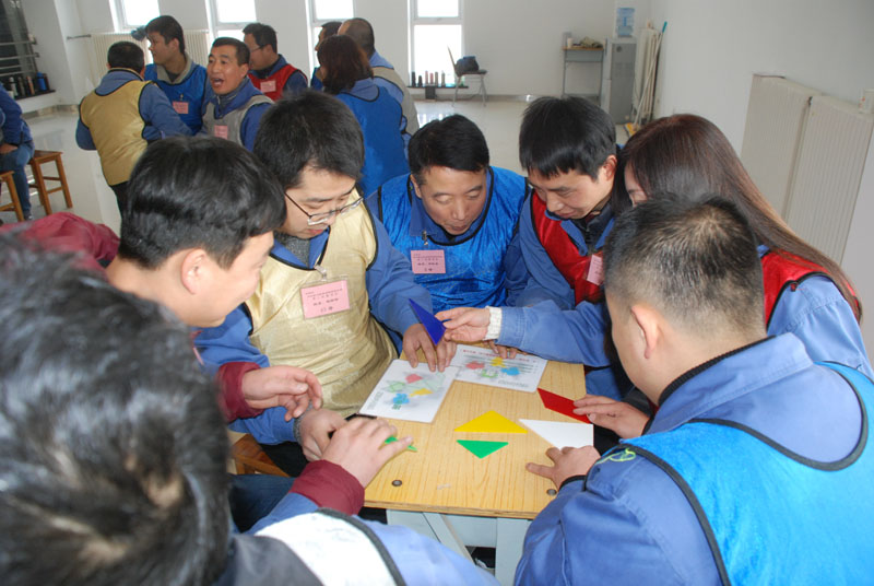 根據(jù)老師的要求,50名隊員按1——4循環(huán)報數(shù),分為4組,分別穿好紅、黃、藍、銀色馬夾后,開始了熱身游戲。在模擬企業(yè)7個部門的梅花型沙盤演練中,全體隊員分為7個小組,以七巧板為道具,按任務(wù)書要求必須在最短的時間內(nèi)完成各自的任務(wù)?;顒又荚诳疾觳⒂柧毚蠹业臏贤āf(xié)調(diào)領(lǐng)導能力,以及團隊意識。此時已臨近中午,董事長蔣保權(quán)在觀看了活動后講話,闡述了團隊及領(lǐng)導的重要性。