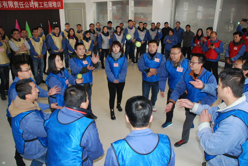 1月12日,銷售部會議室人聲鼎沸,從早上8點到晚上6點20分,一會兒響起高昂有力的口號聲,一會兒響起整齊響亮的吶喊聲。公司邀請的蘭州毅智拓展訓練營的兩位老師正在對公司50名青工進行拓展訓練。集團公司黨委書記、董事長蔣保權(quán),黨委副書記、副總經(jīng)理、工會主席蔣俊放棄休息,前來觀看訓練。公司總工程師劉強,鑄木分廠廠長張巨宏作為觀察員也早早來到現(xiàn)場,進入工作狀態(tài)。工會副主席蔡建欣集合隊員點名之后,交給培訓老師阿杜和海濤帶領(lǐng),開始了緊張有序的訓練。