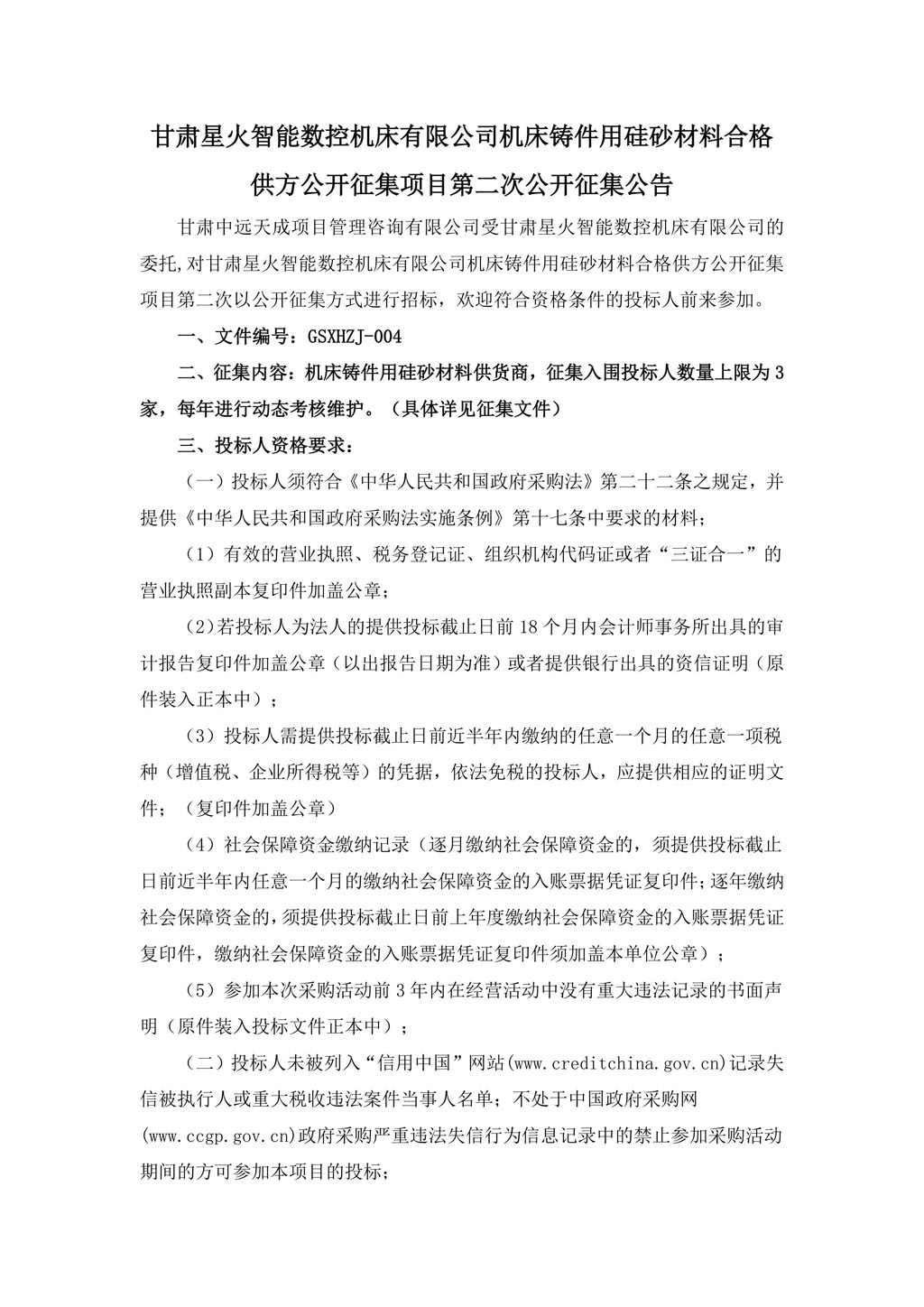 甘肅星火智能數(shù)控機床有限公司機床鑄件用硅砂材料合格供方公開征集項目第二次公開征集公告